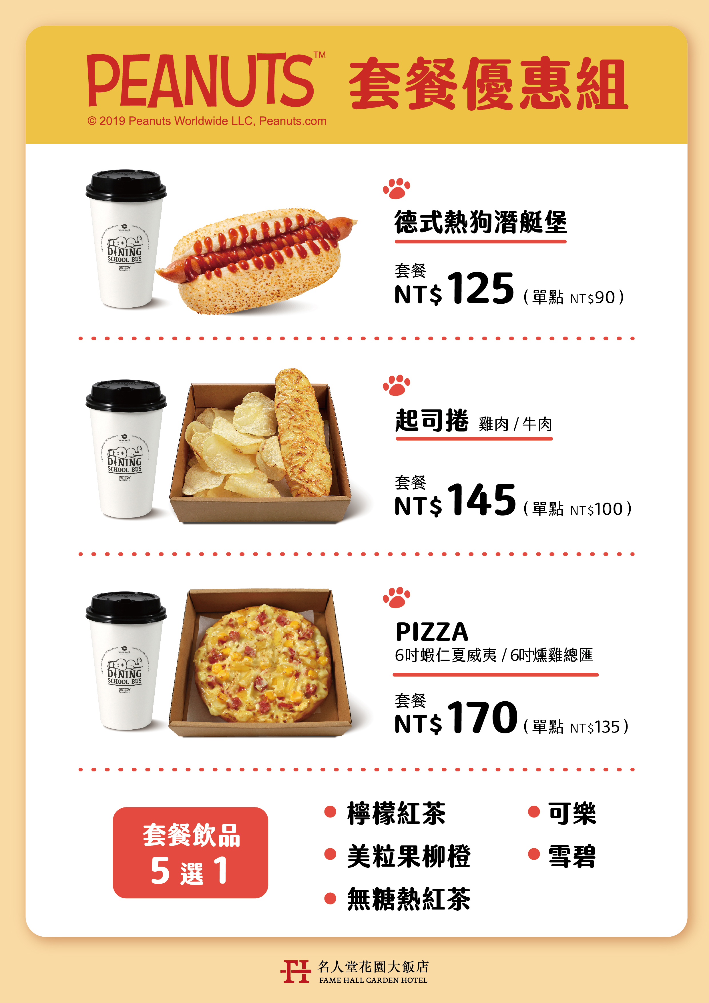 供應史努比愛吃的Pizza及冰淇淋等外帶餐點、加上趣味十足的餐車造型,豐富您的味蕾與視覺感受。