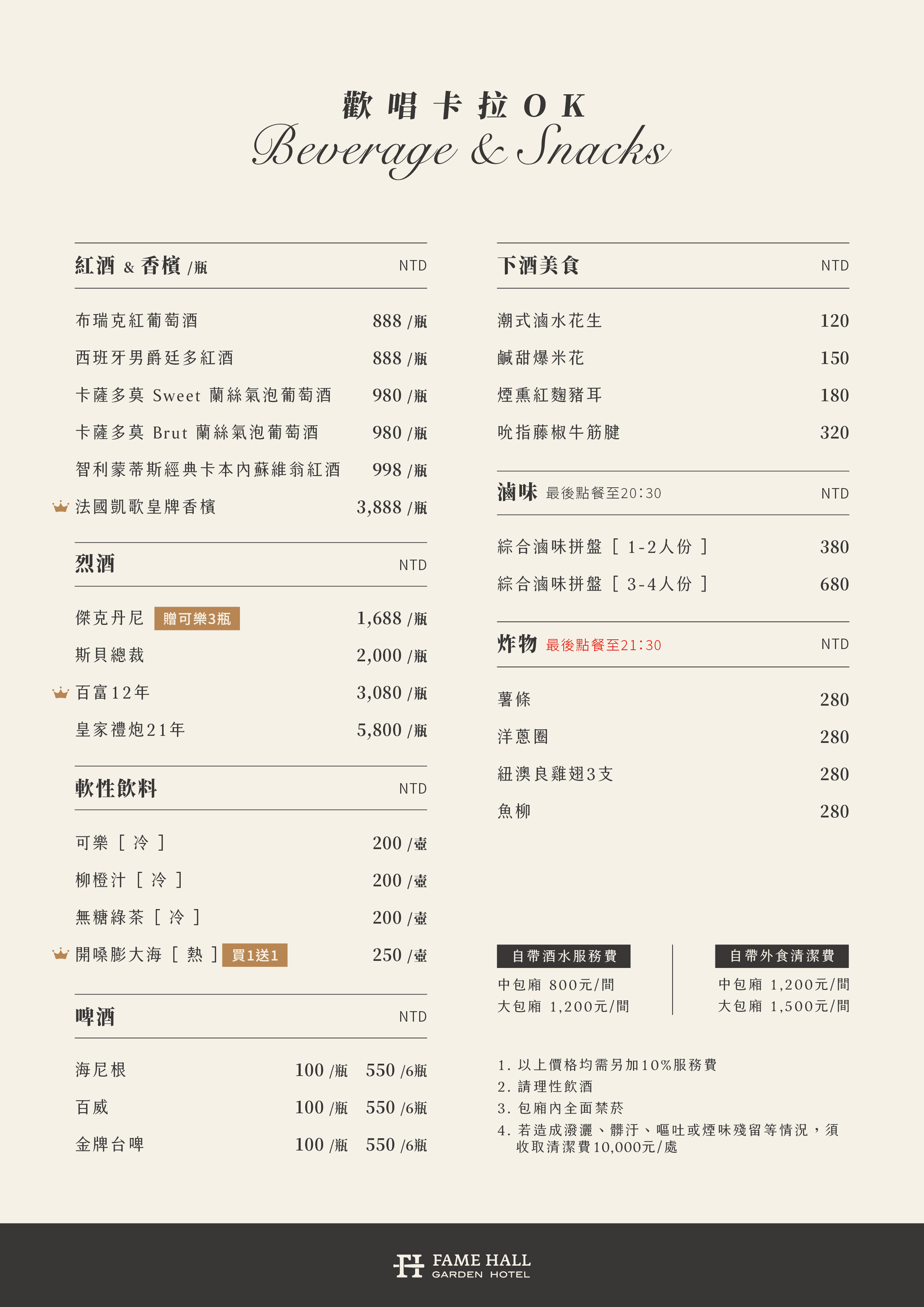 3. Corkage Fee: NTD800 per session for medium rooms, NTD1,200 per session for large rooms.