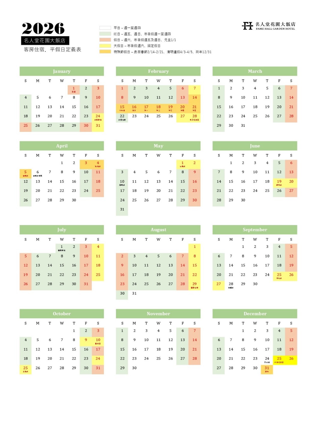 2026 客房住宿、餐廳平假日定義對照表